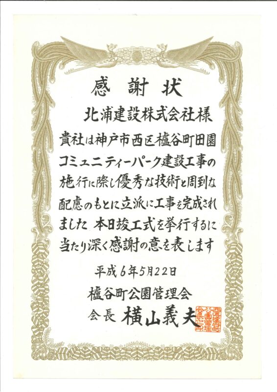 神戸市西区櫨谷町田園コミュニティーパーク建設工事 施工に対する感謝状